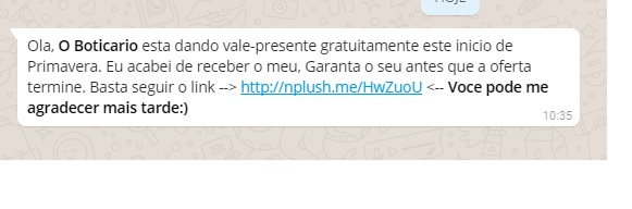 A falsa promoção oferece um cupom grátis de R$ 150 em compras nas lojas da rede. Os criminosos enviam uma mensagem falsa com um link para o suposto cupom, porém a vítima é direcionada a uma página falsa do O Boticário, onde responde a três perguntas, e depois, cadastra seus dados num serviço de SMS pago.