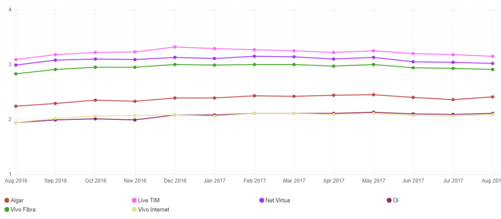 Confira o gráfico que mostra a velocidade média de internet das operadoras nos últimos 12 meses: