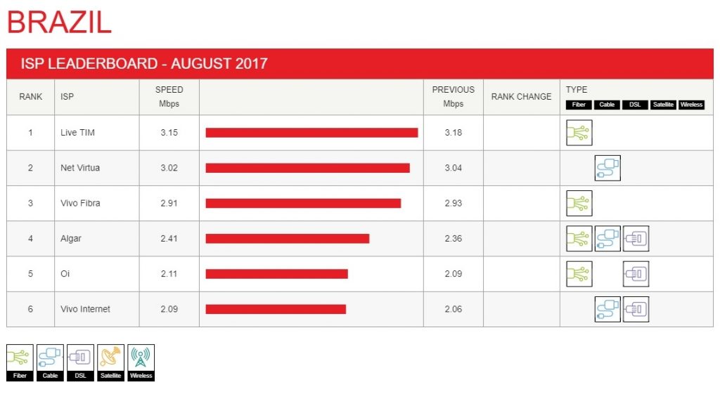 O destaque principal é a queda da velocidade de conexão das operadoras mais bem colocadas no ranking, em relação ao mês anterior. Em contrapartida, Algar, Oi e Vivo Internet, que estão na outra ponta do ranking tiverem leves melhorias na velocidade média de conexão no período.