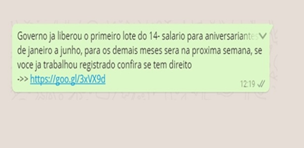 Nesta semana, a empresa de segurança PSAFE divulgou um novo golpe que está sendo aplicado por criminosos no WhatsApp. O novo ataque promete o pagamento de 14° salário. A falsa promessa já foi enviada para mais de 320 mil pessoas pelo aplicativo, mas nem todas chegaram a terem seus aparelhos infectados pelo malware.