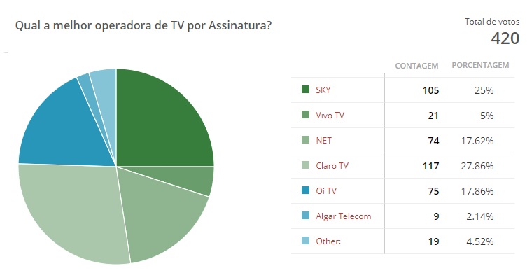 Durante uma semana, recebemos 420 votos em uma enquete fixada na versão para desktop do nosso site e 121 votos em uma votação utilizando reações, disponibilizada em nossa fan page no Facebook. Na primeira, a Claro TV foi a preferida, na segunda, a Oi TV liderou a preferência dos internautas.