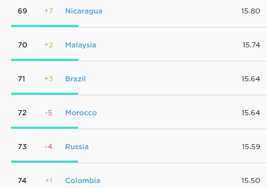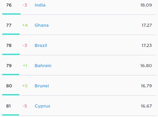 De acordo com o resultado, o Brasil subiu três posições no ranking que avalia a velocidade de conexão na internet móvel, chegando a 71° posição com uma média de 15.64 Mbps de velocidade. A Noruega continua liderando o ranking com uma velocidade média de 59.40 Mbps.