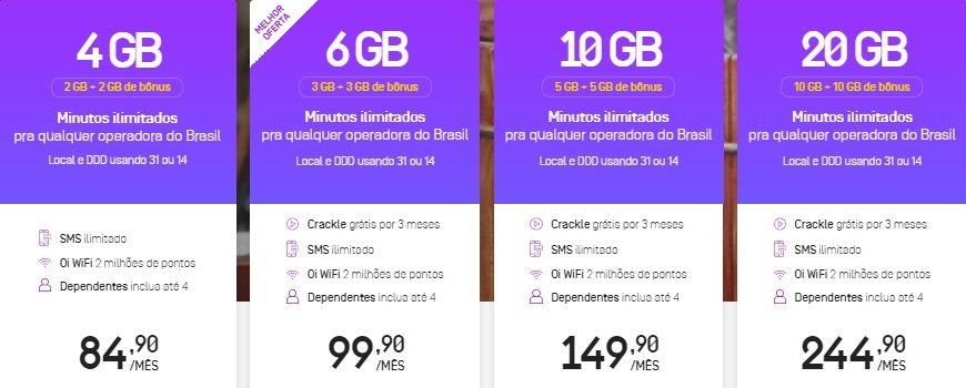Todas as ofertas possuem minutos ilimitados para fixo ou celular de qualquer operadora no Brasil, SMS ilimitado e inclusão de até 4 dependentes.