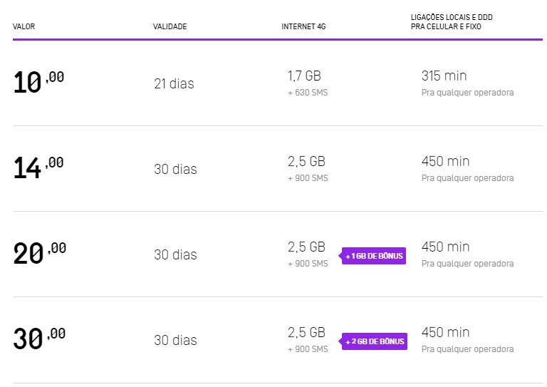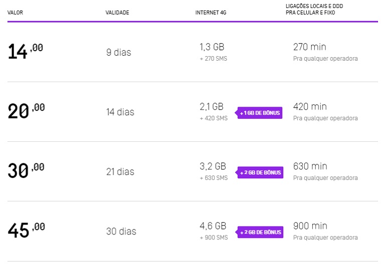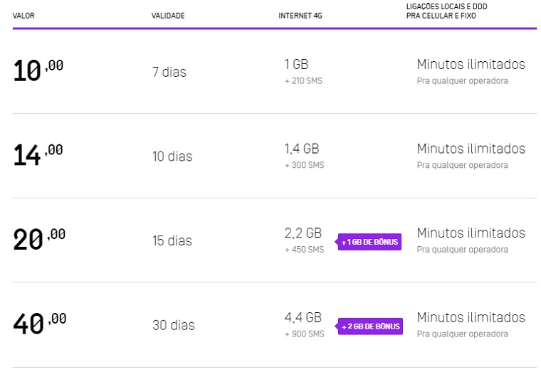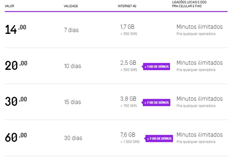 Todas as opções fornecem minutos ilimitadas para qualquer operadora do Brasil e são válidas para todos os DDDs do Brasil.
