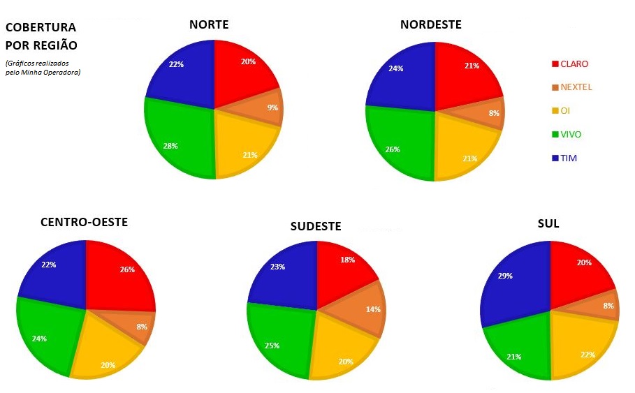 A Claro é líder no Centro-Oeste, enquanto a TIM se destaca na região Sul do país. A Oi se mantém praticamente intacta na soma dos estados, com representatividade entre 20% e 22% em todas as 5 regiões. A Nextel tem maior participação na região Sudeste.