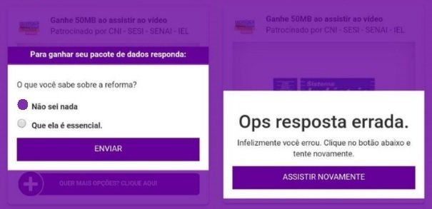 É a favor da reforma da previdência? Ótimo, ganhe internet de graça. Não é? “Resposta errada” e nada de bônus. Esta é a abordagem do novo anúncio da Confederação Nacional da Indústria (CNI), no Vivo Ads, serviço que oferece até 1GB de internet gratuita para clientes pré-pago e controle da Vivo.