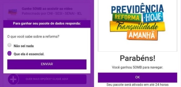 Se responder “da forma correta”, aparece a mensagem “Previdência: Reforma hoje, tranquilidade amanhã. Parabéns! Você ganhou 50MB para navegar. Seu pacote será ativado em até 24 horas”.