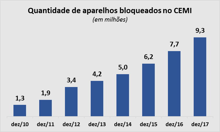 | Número total de IMEIs bloqueados no ano passado, seja por roubo, furto ou extravio, foi de 9,3 milhões. |