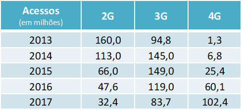 Durante os 12 meses de 2017, os acessos 4G aumentaram 70% e ultrapassaram os 100 milhões, segundo a Telebrasil (Associação Brasileira de Telecomunicações). O balanço de dezembro mostrou que o ano fechou com 3.823 municípios cobertos pela tecnologia, o que já abrange 93% da população brasileira.