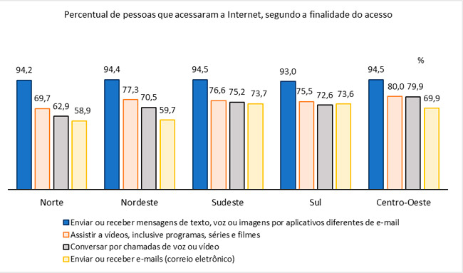 O IBGE divulgou, nesta quarta-feira (21), uma pesquisa sobre os hábitos da população brasileira – pessoas com 10 anos ou mais – em relação à internet e o celular. Em sua primeira constatação, afirmou que 94,2% das pessoas pesquisadas utilizaram a internet para trocar mensagens de texto, voz ou imagens.