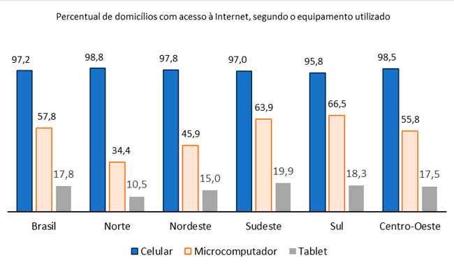 A pesquisa também mostrou que o celular é o único equipamento de acesso à internet em muitos domicílios. Enquanto 38,6% das casas têm só o celular para se conectar, apenas 2,3% têm só computadores. De toda forma, os computadores ainda estão presentes em 57,8% das casas, enquanto o celular com internet em 97,2%.