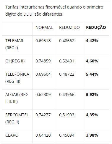 Já em ligações interurbanas feitas de fixo para celular com DDD iniciando com o mesmo dígito (por exemplo, DDDs 61 (DF) para 62 (GO)), o preço médio cai de R$ 0,55 para R$ 0,39. As demais ligações interurbanas vão de R$ 0,62 para R$ 0,45.