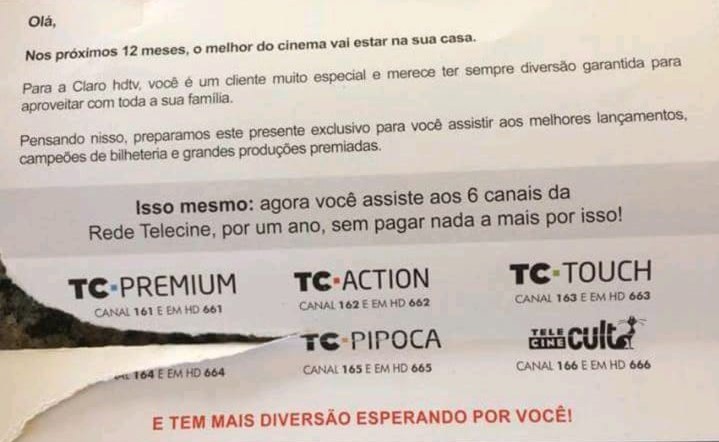 Pelo que apuramos, alguns clientes da Claro receberam uma correspondência em suas casas com o informativo sobre a cortesia. São seis canais gratuitos por 12 meses, o que inclui todos os da rede Telecine – Premium, Action, Touch, Pipoca, Fun e Cult -, que saem em média R$ 39,90 por mês entre as operadoras.