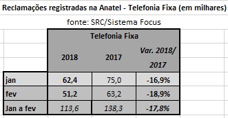 Na telefonia fixa foram registrados, em fevereiro deste ano, 51,2 mil objeções. O número é -18,9% menor que o do ano passado.