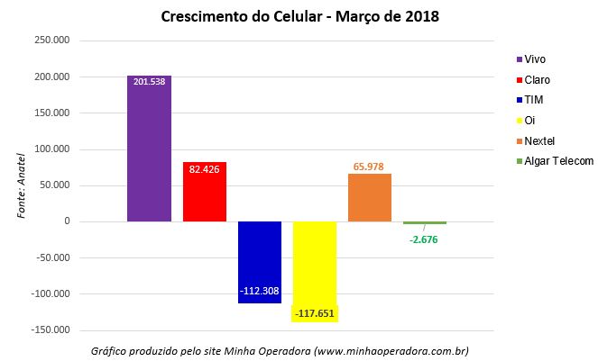 Em números totais, a Vivo foi a que mais aumentou a base de telefonia móvel. Foram 201.538 clientes a mais de fevereiro para março de 2018. Na sequência veio a Claro, que se recuperou da última queda e ganhou 82.426 clientes, e a Nextel (65.978).