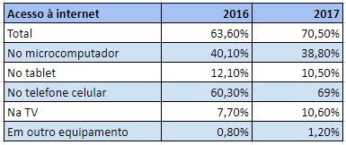 A pesquisa ainda levantou por quais dispositivos as pessoas estavam acessando a internet. Em 69% das residências, o usuário utilizava o celular para se manter conectado. Em 2016, a navegação por meio do dispositivo ocorria em 60,3% das casas.