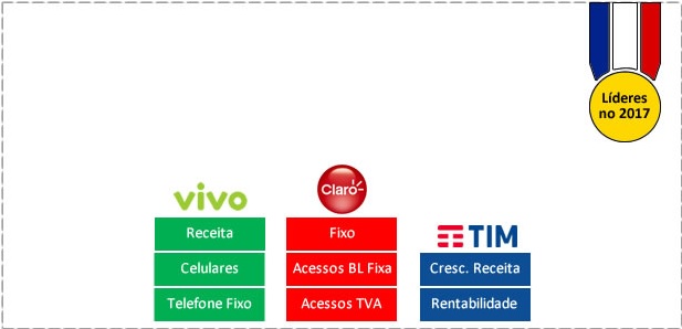 A Vivo é a líder em receita no móvel (R$ 26,5 bilhões) e a Claro em serviços fixos (R$ 23,8 bilhões).