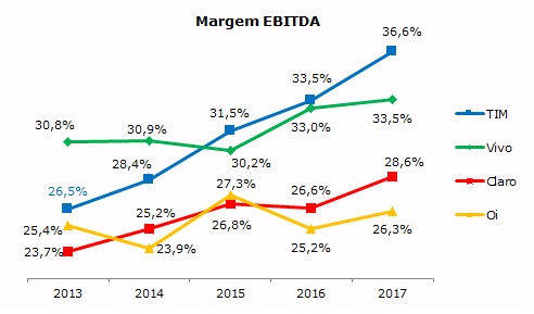 A TIM, que disputa com a Vivo a liderança em margem EBITDA, manteve-se à frente com 36,6% em 2017, seguida pela Vivo (33,5%). Todas as quatro operadoras apresentaram crescimento em sua margem EBITDA em 2017.