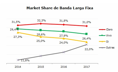A Claro manteve a liderança em market share de banda larga fixa em 2017 com 8,9 milhões de acessos. O destaque ficou, no entanto, com as operadoras menores (competitivas), que ganharam market share no ano.