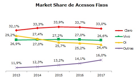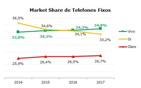A Vivo manteve a liderança em market share de telefonia fixa com 14,1 milhões de telefones fixos em 2017 e a Oi (13,5 milhões) continua perdendo mercado. A Claro se manteve estável com 26,7% de market share.