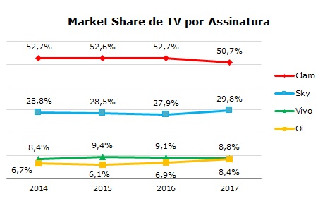 A Claro, com a marca NET, continuou na liderança da TV por Assinatura em 2017 com 9,1 milhões de assinantes e 50,7% de market share. Atrás está a Sky, com 29,8% de market share.