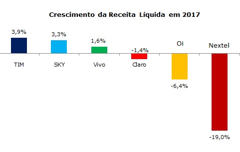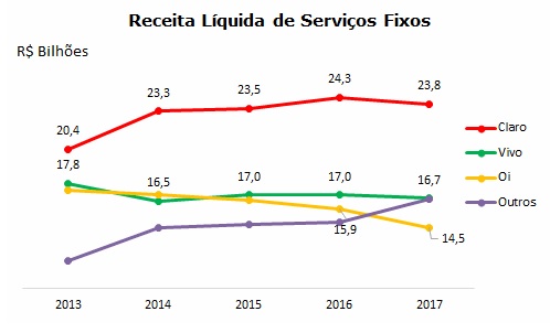 No entanto, apesar da Claro manter a liderança em receita líquida de serviços fixos com R$ 23,8 bilhões, teve crescimento negativo de -1,9% em 2017. As demais operadoras também viram suas receitas reduzirem no segmento.