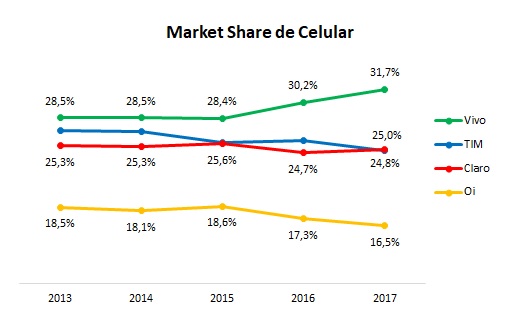 A TIM (24,8%) perdeu sua segunda colocação em 2016 para a Claro (25,0%) em 2017.