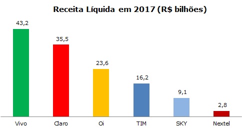 A Vivo liderou o ranking no indicador de receita líquida, com faturamento de R$ 43,2 bilhões em 2017. A Claro conquistou o segundo lugar, com R$ 35,5 bilhões.