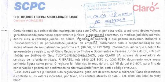 Na última quarta-feira (9), o site Metrópoles divulgou uma correspondência da Claro para a Secretaria de Saúde do DF na qual a operadora cobrava uma dívida da pasta em tons ameaçadores.