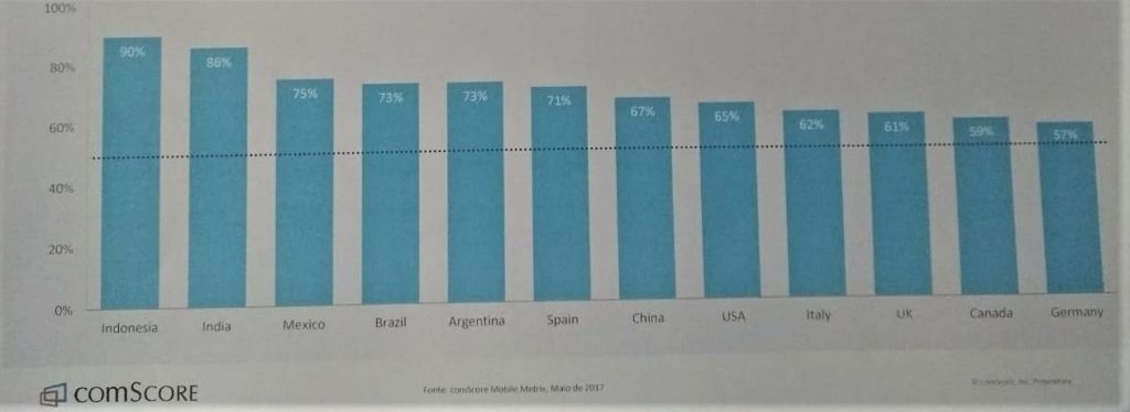 No Brasil, são 29%, dividindo o tempo com o desktop e outras plataformas. De toda forma, de maio de 2016 para maio de 2017, essa média aumentou 7%, crescimento maior do que nos Estados Unidos e na Espanha.