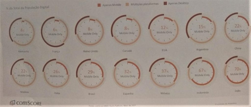 Segundo a pesquisa, mais de ¼ dos usuários globais só utiliza o mobile: são os chamados usuários “mobile only”. Na Índia, por exemplo, 70% dos usuários usam apenas o mobile.