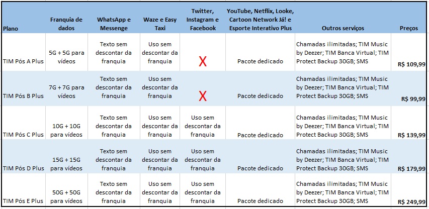 As ofertas estão liberadas para todos os DDDs de todos os estados. Veja na tabela abaixo como o uso ilimitado dos aplicativos ficou distribuído nos planos pós-pago da operadora.
