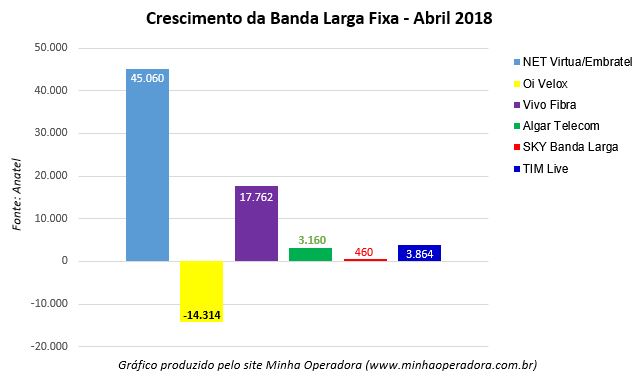 O mês terminou com um total de 29.946.771 assinantes de banda larga no Brasil. Deste total, 30,4% são da NET Virtua/Embratel (9 milhões de clientes); 25,6% do Vivo Fibra (7,6 milhões); 20,7% do Oi Velox (6,2 milhões); 1,8% já da Algar Telecom (557.588); 1,4% do TIM Live (434.280); e, por último, 1,2% da SKY Banda Larga (359.393).