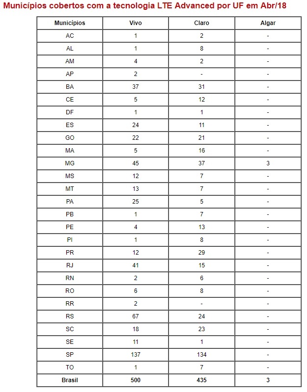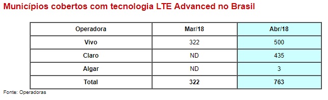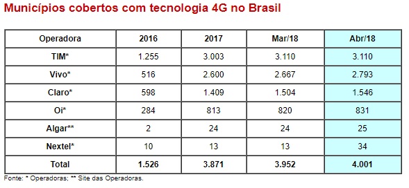 Somente no mês de abril, a Vivo expandiu a sua cobertura 4G para 126 municípios. Já a Claro levou a tecnologia para 42 novas cidades, a Nextel para 21, a Oi para 11 e a Algar para 1. Na TIM não houve expansão no último mês, segundo dados do Teleco.