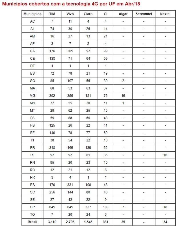 A Oi liberou o sinal de 4G para 831 municípios (67,3% da população), a Nextel para 34 cidades (15% da população) e a Algar para 25 (cobrindo apenas 1,2% da população).