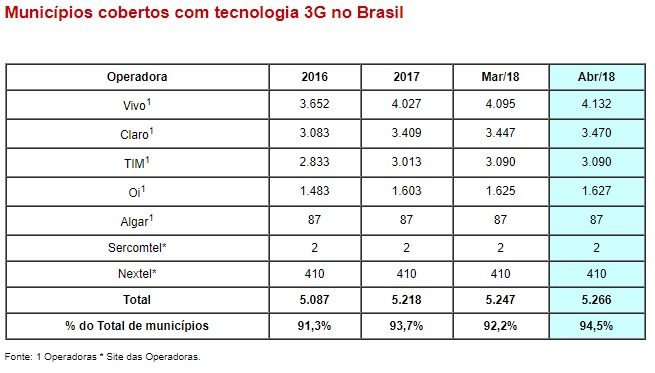A Vivo leva cobertura 3G para 4.132 cidades, a Claro para 3.470, a TIM para 3.090 e a Oi para 1.627.
