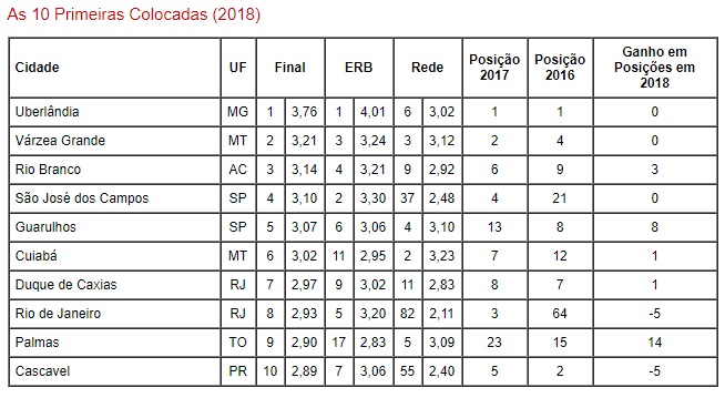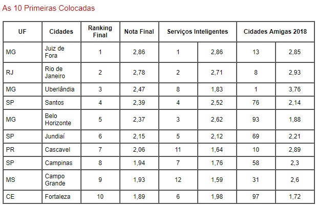 Nesse ranking, a cidade mineira de Juiz de Fora ficou com o lugar mais alto do pódio. Rio de Janeiro e Uberlândia ocuparam a segunda e terceira colocação, respectivamente.