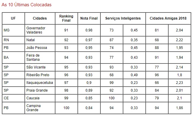 Os municípios que tiveram o pior desempenho no Ranking de Serviços das Cidades Inteligentes foram Caucaia (CE) e Campina Grande (PB).