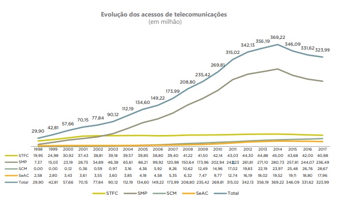 O setor só aumentava depois disso e chegou ao recorde de acessos em 2014: 369,2 milhões. Acontece que, nos últimos três anos, os acessos vêm caindo. Os dados mais recentes são de 2017, quando o Brasil fechou em 324 milhões de acessos, um volume 2,3% inferior ao registrado em 2016. O único dos serviços que registrou crescimento foi o de banda larga fixa – móvel, fixo e TV paga caíram.
