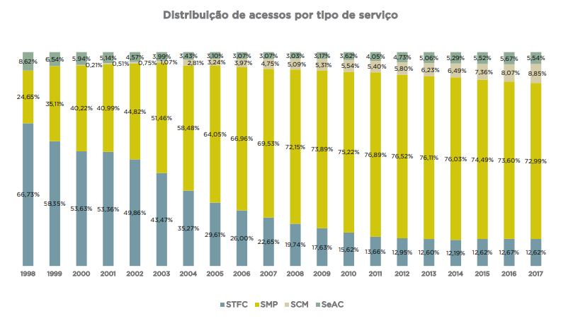 Um segundo balanço mostra que, em 1998, a telefonia fixa respondia por 66,7% dos acessos de serviços de telecomunicações. Vinte anos depois, o serviço com maior percentual de acessos, em disparada, é a telefonia móvel, com 73% do total.