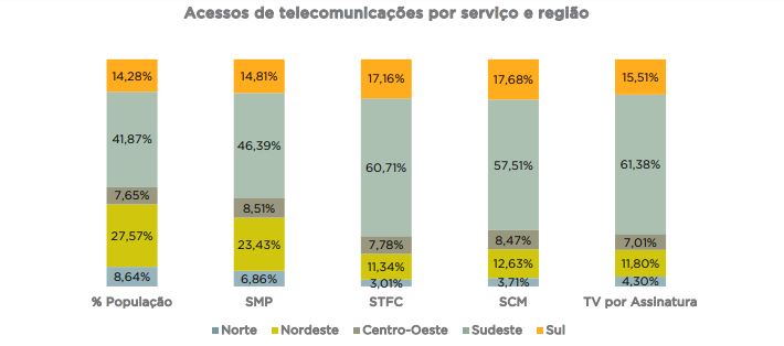 Em relação às regiões brasileiras que contam com os quatro principais serviços de telecom, a Anatel afirma que a densidade dos serviços ainda é bastante desigual no Brasil.