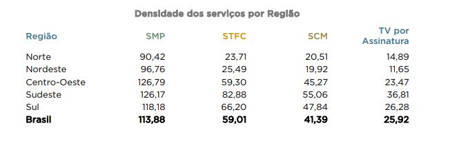 A Anatel também calculou a densidade dos serviços de telecom em cada região. O cálculo é feito com base no número de acessos por grupo de 100 domicílios, no caso de telefonia fixa, TV paga e banda larga, enquanto o da telefonia móvel considera acessos por grupo de 100 habitantes.