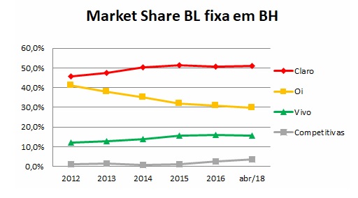 A Claro é a líder isolada em Belo Horizonte, com um market share de 51,2%.