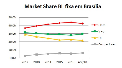A Claro também lidera o segmento em Brasília, onde vem mantendo o pódio há alguns anos. Em abril, o market share da operadora era de 42,6% na cidade.