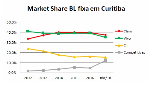 Desde 2013, Claro e Vivo vêm disputando a liderança em banda larga fixa em Curitiba. Atualmente, a Claro leva vantagem com 14,6 mil acessos a mais que a Vivo.