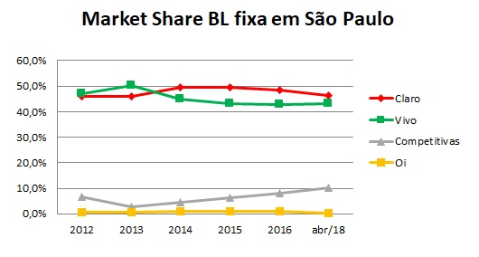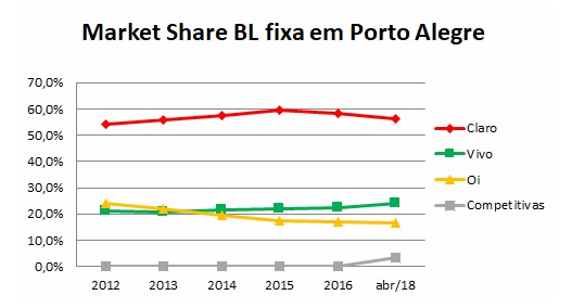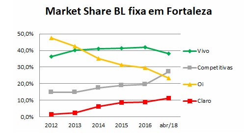 Apesar de não ser a líder em nenhuma destas capitais, as operadoras competitivas (outras que não estas três, como a TIM) possuem 10,1% dos acessos de banda larga fixa destas dez capitais.