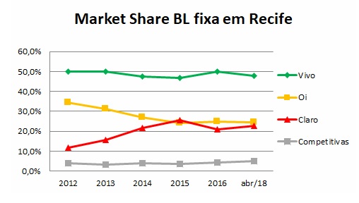 A Oi, que era a líder em 2012, foi perdendo espaço, sendo superada até mesmo pelas competitivas. Entre estas outras operadoras destacam-se a Videomar e a SKY com 12,8% e 3,4%, respectivamente.