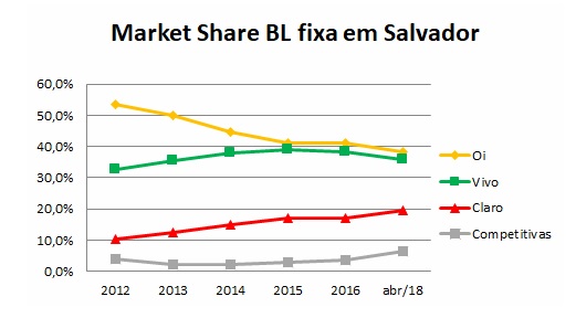 Em Salvador, desde 2015, a disputa vem sendo acirrada entre Oi e Vivo. Em abril, a diferença entre as duas operadoras era de 10 mil acessos.