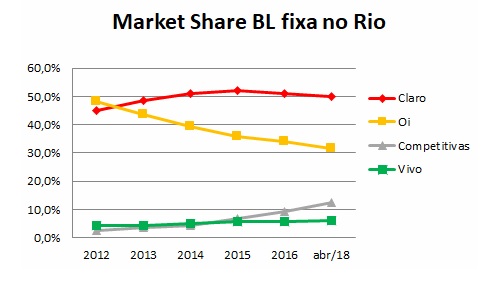 Em terras cariocas, quem lidera em banda larga fixa é a Claro, com um market share de 50%.