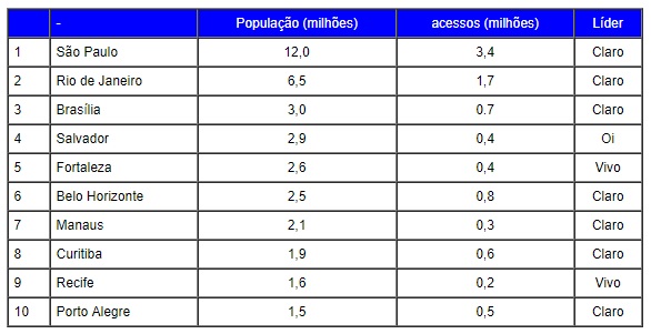 São Paulo, Rio de Janeiro, Brasília, Salvador, Fortaleza, Belo Horizonte, Manaus, Curitiba, Recife e Porto Alegre concentram 17,5% da população brasileira e 30,3% dos acessos em banda larga fixa, segundo dados de abril deste ano.